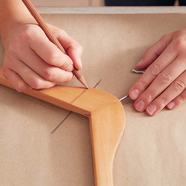Etape 1 : Commencez par marquer un modèle. Tracez les contours du porte manteau sur un papier et marquez la ligne où la partie du cintre doit être sciée. En utilisant votre modèle papier vous pouvez maintenant transférer la ligne de sciage sur vos 5 autres cintres. (Photo Dremel).Lire la suite