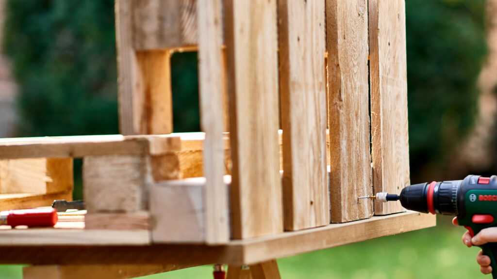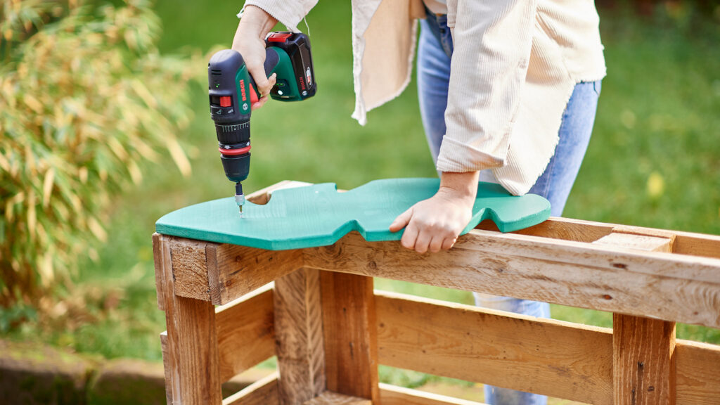 La partie inférieure de ce morceau de palette – sans la planche supérieure – est maintenant vissée comme support à la palette grâce à votre perceuse-visseuse. Visuellement, vous avez donc à nouveau deux palettes complètes, mais plus étroites.