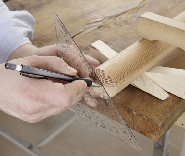 Dans un deuxième temps, il s‘agit de percer. Fixer pour cela le bâton de bois sur la table de travail de sorte que la ligne de repère de gauche soit précisément orientée vers le haut. Afin que les baguettes soient ensuite solidement fixées dans le bâton malgré leur forme étroite, mesurer avant le perçage à l‘aide du mètre ruban la circonférence de la tête des baguettes (pointe en forme de boule) et calculer le diamètre (voir encadré). Dans cet exemple, il fait 10 mm. Déterminer ensuite la hauteur du manche de la baguette qui a un diamètre de 10 mm exactement comme la tête. Pour assurer une stabilité optimale, les baguettes devraient ensuite être enfoncées dans le bâton jusqu‘à cette hauteur déterminée.