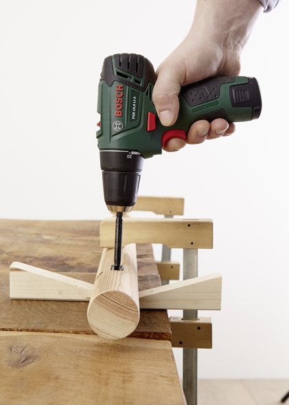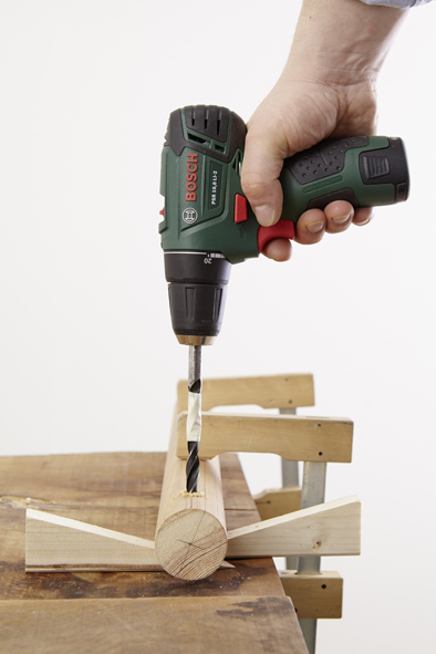 Astuce : marquer la profondeur nécessaire des trous avec un peu de ruban crêpe sur la mèche à bois. Cela signifie que les trous doivent être percés avec la profondeur correspondante. Pour cela, mesurer à l‘aide du mètre ruban la longueur de manche comprise entre le point déterminé et la tête de la baguette. Il est indispensable de veiller à ce que le bâton ne soit pas transpercé. Ensuite, percer les trous marqués au préalable avec la profondeur nécessaire dans le bâton de bois à l‘aide de la perceuse-visseuse sans fil PSR 10,8 LI-2 Bosch et d‘une mèche à bois (10 mm). Enfin, fixer le bâton à la table de travail de sorte que la ligne de repère de droite soit orientée vers le haut et pour faire les trous de ce côté. Le diamètre peut être calculé à l‘aide de .la circonférence grâce à la formule suivante : circonférence / PI (env. 3,142) = diamètre.