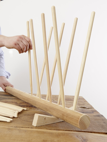 Pour finir, effacer soigneusement toutes les lignes de repère et placer les supports à chaussures et les pieds dans les trous. Si on le souhaite, il est possible d‘enduire au préalable les baguettes d‘un peu de colle à bois pour leur donner une tenue supplémentaire.