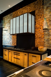 Le bois de bout s’affiche pour encadrer une hotte, un plan de cuisson, jouer les tableaux et réchauffer l’espace de sa présence inattendue. Cet assemblage de rondelles de racines de teck de récupération résiste à l’humidité.
