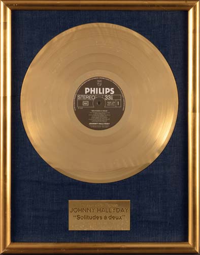 Disque d’or DE Johnny Hallyday pour le 33 tours Solitudes à deux. Trophée officiel certifié par le SNEPA en juillet 1978 (100.000 exemplaires vendus). Avec encadrement d’origine. Format : 47 x 37 cm Pièce de musée pour l’un des 40 disques d’or de l’exceptionnelle carrière de Johnny Hallyday. Trophée non commercial fabriqué en quelques exemplaires pour le compte des auteurs et de l’éditeur. Un certificat d’authenticité sera délivré à l’acquéreur. Provenance : collection Didier Barbelivien. Estimation : 1 500 / 2 000 €.Lire la suite