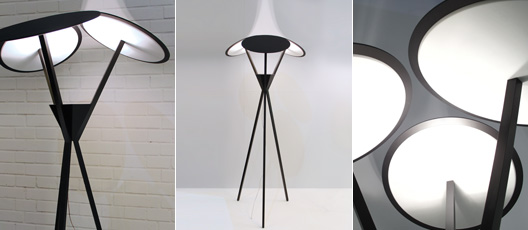 Trois disques viennent coiffer le lampadaire, vers lesquels trois projecteurs Leds sont orientés. Des pièces de PMMA (verre acrylique d’une résistance et d’une légèreté appréciables) jouent les réflecteurs pour diffuser une lumière indirecte, confortable, orientée vers le sol, tandis que la partie haute du triptyque, très graphique, guide la luminosité vers le haut.