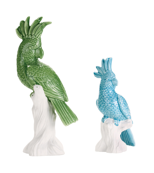 Perruches « Marjojo » en céramique. L 8,5 x H 20 x P 7,5 cm (8,99 €), L 13 x H 28 x P 9 cm, 16,99 € (www.confodéco).Coussin « Toucan » en coton, L 60 x 160 cm. 49 € (www.westwing.fr).Tapis « Sowa Acqua » en laine de Nouvelle-Zélande et soie végétale. Dimensions : 170 x 240 cm et 200 x 300 cm. A partir de 1 519 € (www.sergelesage.com ).Fauteuil « Seconde Nature» en bois de noyer et cuir pleine fleur. L 85 x 162 x H 145 cm. 3 950 € (www.nowshome.fr).Vase « Snake » en verre soufflé. Hauteur 23 cm. 540 € (www.nowshome.fr).Salon de jardin « Mali », structure en acier, revêtement en rotin polyéthylène. Table : L 70 x P 70 x H 73 cm. Chaises : L 46 x P 58 x H 82 cm. 149 € (www.made.com).