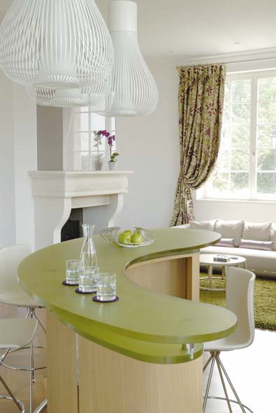 Entre le salon-bibliothèque et le jardin d’hiver se trouve le bar. Il a été réalisé par Borella Art Design dans un panneau de résine qui reflète la lumière des suspensions (Patricia Urquiola). Son plateau couleur vert d’eau rappelle la nature et sa structure en bois blond réchauffe l’ambiance. © Jo PesendorferLire la suite