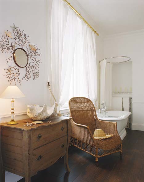 La baignoire de la chambre blanche, la plus grande pièce du Jura Lodge et la seule avec 3 fenêtres donnant sur la mer. Un énorme coquillage posé sur la commode fait office de vide-poches. Des coquillages et étoiles de mer ont été rajoutés au miroir en fer forgé orné de corail. Lire la suite