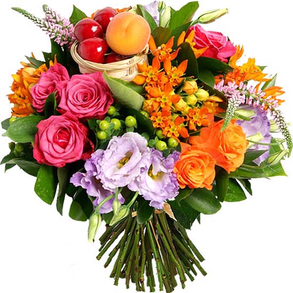 Ce bouquet gourmand est surmonté d’un joli petit panier d’osier garni de cerises et abricot mûrs, prêts à déguster. Composé de roses « Amalia » et « Kalahari », d’asclépias « Beatrix » orange vif, de lisianthus parme, de véroniques roses et de branches d’hypericum vert (À partir de 35 €).