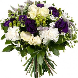 Charme et élégance se marient dans ce bouquet rafraîchissant composé de roses « Avalanche », de lisianthus violets, de dianthus blancs et de délicates fleurs de phlox. Quelques jolies branches de menthe poivrée lui confèrent piquant et caractère (À partir de 35 €).