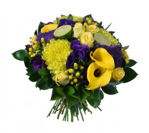 Ce bouquet aux couleurs piquantes et éclatantes rappelle délicieusement le Brésil. Au centre, des roses jaunes acidulées, des callas et du chrysanthème « Zembla Brasil » se démarquent des bleus du lisianthus et du trachellium. Les verts du feuillage et des citrons apportent la touche finale à cette composition festive et bien dans l’air du temps (À partir de 35 €).
