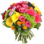 « Ardoise et craies » est une composition vitaminée où se mélangent de belles roses « Amalia », de sublimes santinis « Froggy » vert acidulé mêlés à différentes variétés d’œillets, de callas jaunes et du carthamus orange. (A partir de 35 €).