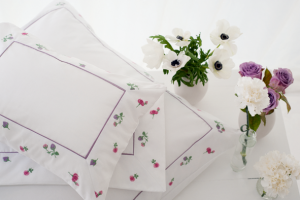 Nina Ricci Maison propose pour sa nouvelle collection un semis de délicats boutons de rose brodés sur percale blanche 100% coton 80 fils/cm² annonce la douceur d’un printemps. Ce modèle est brodé avec soin dans le nord de la France. La housse de couette est entièrement brodée sur son recto tandis que le drap est habillé d’un parement brodé. Les taies et housses de coussins sont encadrées d’un volant brodé, finies par des coins onglet et soulignées par un biais mauve. Housse de couette à partir de 200,50 € / Taie : 63 €