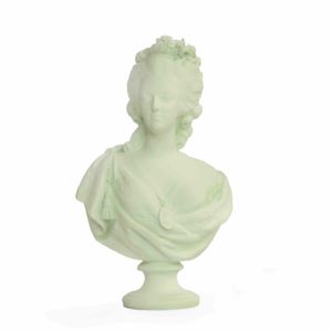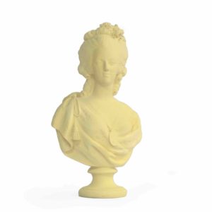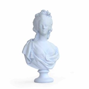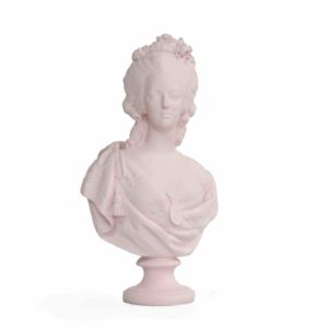 Marie-Antoinette a su s’entourer des artistes les plus talentueux de son époque. Reine depuis neuf ans et mère de deux enfants, elle n’a que vingt-huit ans lorsque Félix Lecomte, sculpteur français, réalisa en 1783 son buste en marbre de Carrare. Drapée du manteau royal fleur de lys, doublé d’hermine, la reine de France y est représentée dans toute la dignité de sa fonction. Sa haute perruque enrichie de fleurs retenues par un ruban, laisse paraitre une rose finement travaillée. A son cou, la souveraine porte un médaillon ciselé du profil de Louis XVI. Aujourd’hui, La Réunion des Musées Nationaux propose une version colorée du buste de Marie-Antoinette : vert bosquet, jaune gourmand, rose poudré, ou bleu tendre, une édition limitée à cinq exemplaires par couleur. Cette réduction de 15 cm de hauteur a été réalisée sur l’original à partir d’un moule fabriqué grâce à la technique de la prise d’empreinte 3D. Elle a ensuite été patinée à la main d’une couleur tendre pour évoquer l’éclat de la jeunesse de la souveraine. Chaque reproduction est datée et signée de la patineuse. Vente en exclusivité sur www.boutiquesdemusees.fr (155 €).
