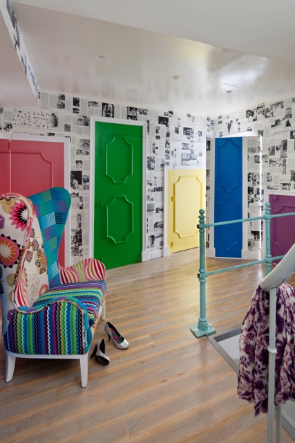 Trompe l’œil « Alice aux Pays des Merveilles ». L’idée était d’occulter tant que se peut les 7 portes de ce palier situé au 1er étage qui dessert les pièces à sommeil et les pièces d’eau. Ainsi est née cette idée, où les fausses portes sont mis en avant via des couleurs flashies et des moulures en polypropylène ; les couleurs vives des portes sont d’autant plus vues qu’elles sont ornées de tapisseries volontairement monochromes, réalisées à partir d’archives Paris Match. © A-C Scoffoni.Lire la suite