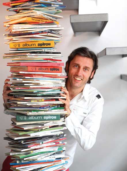 Carlos, derrière une des créations dont il est le plus fier : la colonne de bandes-dessinées, qui masque un poteau métallique (nécessaire à la portée de la structure) en son cœur ! © A-C Scoffoni.Lire la suite