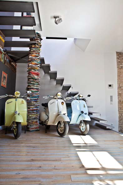 Escalier latéral auto-porté sur -mesure, réalisé par Carlos pour accéder au bureau. © A-C Scoffoni.Lire la suite