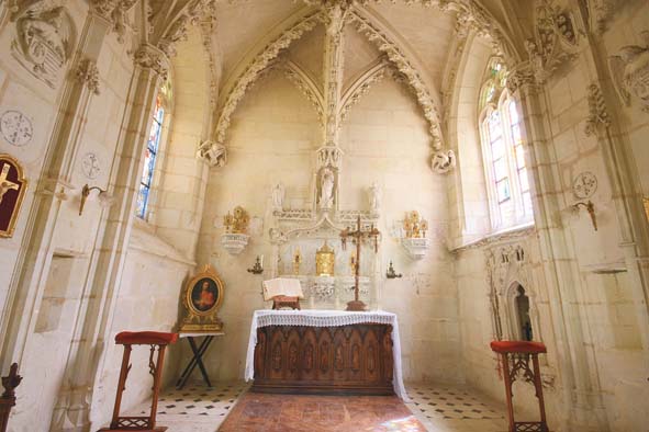 Une chapelle a été installée au XVème siècle dans le château. Cette merveille de l’art gothique, n’a jamais été restaurée depuis sa construction. La voûte dédiée au couronnement de la Vierge Marie est richement sculptée dans la pierre de tuffeau. Sur le tabernable XIXème, la grande croix XIXème est une pièce exceptionnelle. Elle supporte les instruments de la passion du Christ. De part et d’autre, sont posés des reliquaires de différents saints. A droite, la partie haute des vitraux date de 1451, la partie basse de 1836. Lire la suite