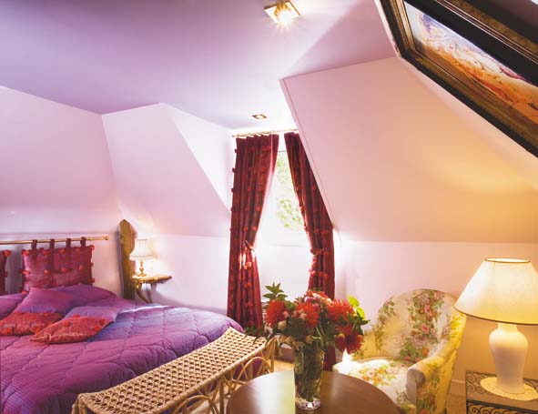 Ambiance reposante pour cette chambre mansardée aux tons parmes. Petite table console en bois doré servant de chevet, chiné à Honfleur. Jeté de lit Madura. Coussins et rideaux à pompons assortis réalisés par une jeune styliste normande.Petite bergère gardée dans son jus avec son tissu des années 1950.Lire la suite