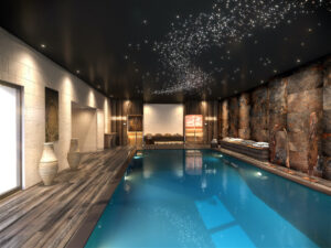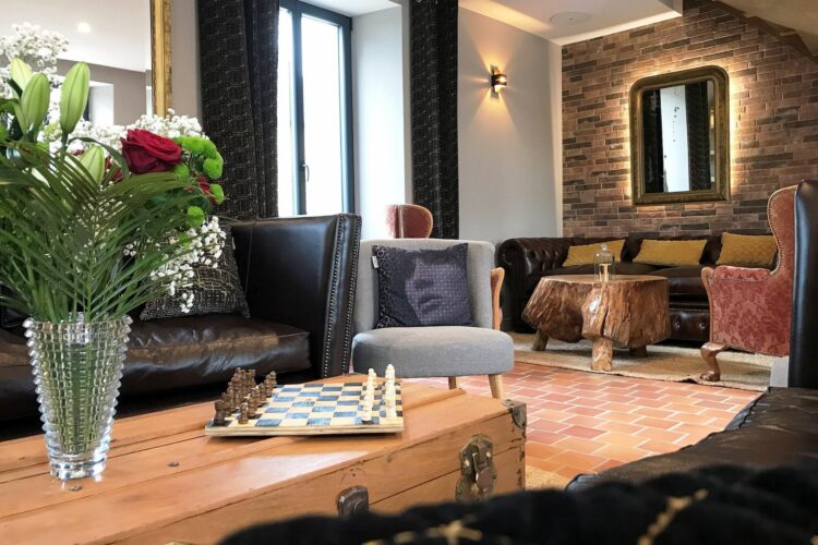 Dès l’entrée, une magnifique porte antique en bois massif et ferronnerie artisanale donne le ton. La décoration a été pensée en cohérence avec l’atmosphère et le style de la maison, un subtil mélange d’authenticité et de contemporanéité. Bois flotté, marbre et carrelage en pierre créent une ambiance unique et chaleureuse. Le petit salon d’accueil est composé d’une banquette Louis XV, d’un fauteuil cabriolet, d’une malle et d’un miroir de style Renaissance, l’ensemble entièrement restauré. La piscine est baignée de lumière, grâce à de grandes baies vitrées qui permettent d’accéder sur la terrasse extérieure. Cet espace dispose également d’un sauna finlandais avec halothérapie, d’un hammam et d’une tisanerie. Deux grandes banquettes en bois massif exotique permettent de se détendre confortablement. L’espace bien-être et sa cabine spa double sont hébergés dans un ancien bâtiment dont l’architecture a été préservée. Les murs de pierres et d’anciennes poutres en bois massif ont été restaurés. Cette cabine, à l’esprit cosy, est équipée d’une salle de bain privative, où sont proposés des soins et massages à la carte.