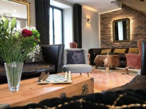 La décoration mixe authenticité, grâce à des matériaux bruts, naturels et nobles pour respecter le style d’origine, avec des touches contemporaines. La propriété dispose de deux suites, dont l’une a conservé sa charpente bateau artisanale, et de deux chambres doubles, entièrement équipées, toutes avec vue sur le parc. Deux salons intérieurs, agrémentés de cheminées et de mobilier confortable composent ce lieu. Au sol, les tomettes d’antan ont été conservées et restaurées grâce à des méthodes traditionnelles. Une grande terrasse extérieure invite à se prélasser au son du ruissellement de l’eau de la cascade. Le bois est planté de tulipiers de Virginie, de châtaigniers, de noisetiers, de cerisiers…