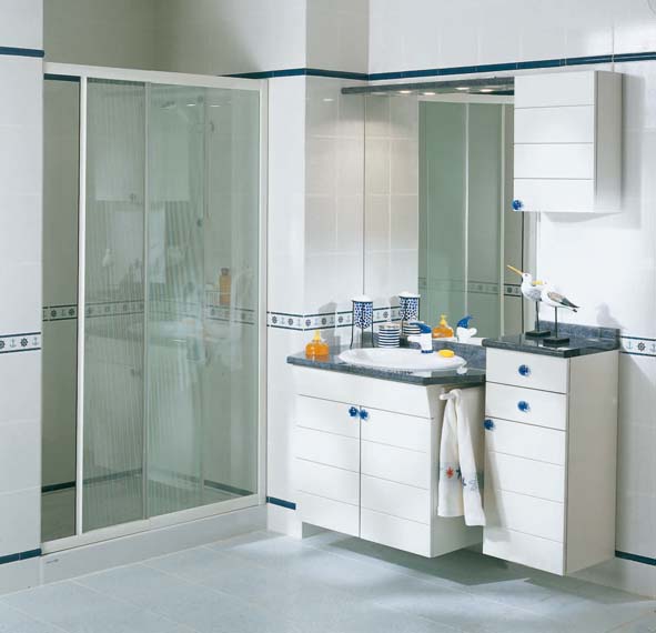 Le système de douche le plus répandu est constitué d’un bac, d’une douchette avec tuyau flexible et d’un rideau ou paroi de protection contre les éclaboussures. Sont maintenant également disponibles des cabines équipées où la douchette et son flexible sont remplacés par un ensemble de buses d’où l’eau jaillit en jet. Les lavabos et les cuvettes de WC, peuvent reposer sur le sol par l’intermédiaire d’une colonne, d’un socle ou bien être accrochés à une des parois de la salle de bains par l’intermédiaire d’un bâti-support spécialement adapté aux équipements. Avec ces appareils suspendus, le nettoyage du sol est facilité ainsi que l’accès pour entretien au siphon du lavabo. La robinetterie fait l’objet d’une offre très importante. On distingue les robinets séparés pour l’eau froide et l’eau chaude, les mélangeurs qui possèdent également deux têtes séparées mais une seule sortie, les mitigeurs qui permettent de régler la température de l’eau et son débit à l’aide d’une seule manette de commande. Certains mitigeurs, dits « thermostatiques« , sont conçus pour que la température de l’eau reste constante pendant l’utilisation du robinet. Pour aider au choix face à une offre abondante, il est conseillé de sélectionner des produits aux performances certifiées (solidité des appareils suspendus, bon écoulement de l’eau dans les bacs à douche, niveau sonore des robinets…).
