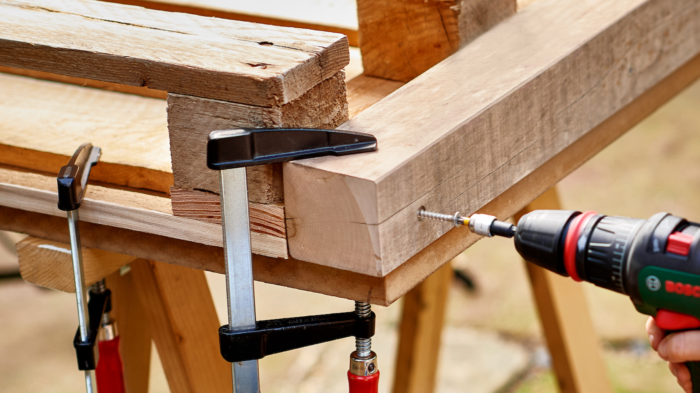 Utiliser votre perceuse-visseuse à percussion pour visser à la tête et au pied du lit une poutre plus épaisse, de la même largeur que la palette (700 mm). Vous devrez la scier au préalable avec votre scie sauteuse. Pour cela, placez une longue vis de 100 mm de long sur les côtés droit et gauche.