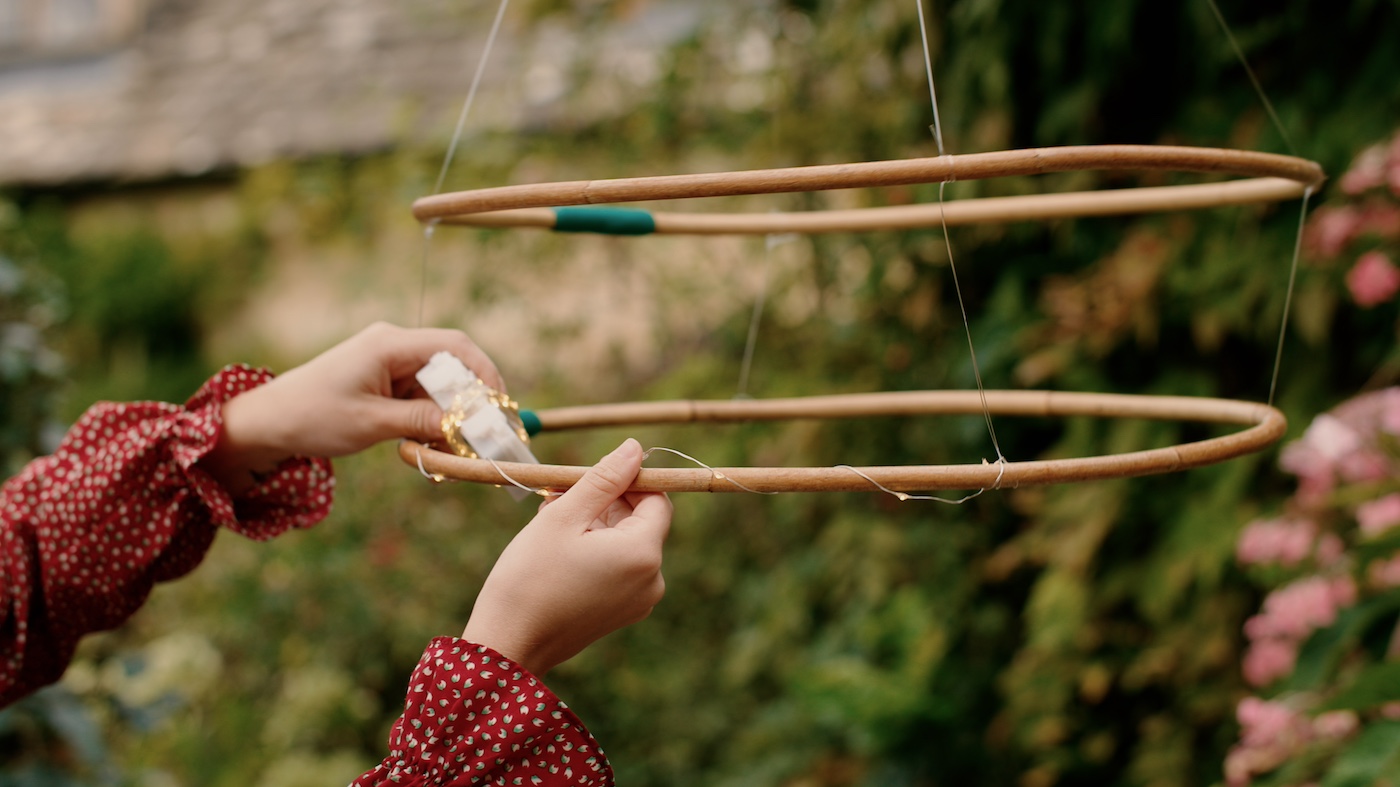 Prenez maintenant le second cerceau, attachez quatre fils de longueur plus courte à quatre points différents du cercle. Nouez ensuite ces quatre longueurs de fil au premier cerceau suspendu, pour que le second cerceau se trouve juste au-dessous. Pour illuminer subtilement votre nouveau lustre, choisissez des guirlandes lumineuses d’extérieur et entrelacez-les autour du cerceau inférieur puis remontez vers le cerceau supérieur.Lire la suite