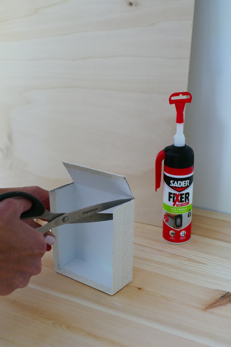 Étape 1 : Commencer par découper une des deux largeurs de la petite boîte en carton. Réserver cette boite pour plus tard, elle servira de petit rangement pour les feutres ou stylos.Lire la suite