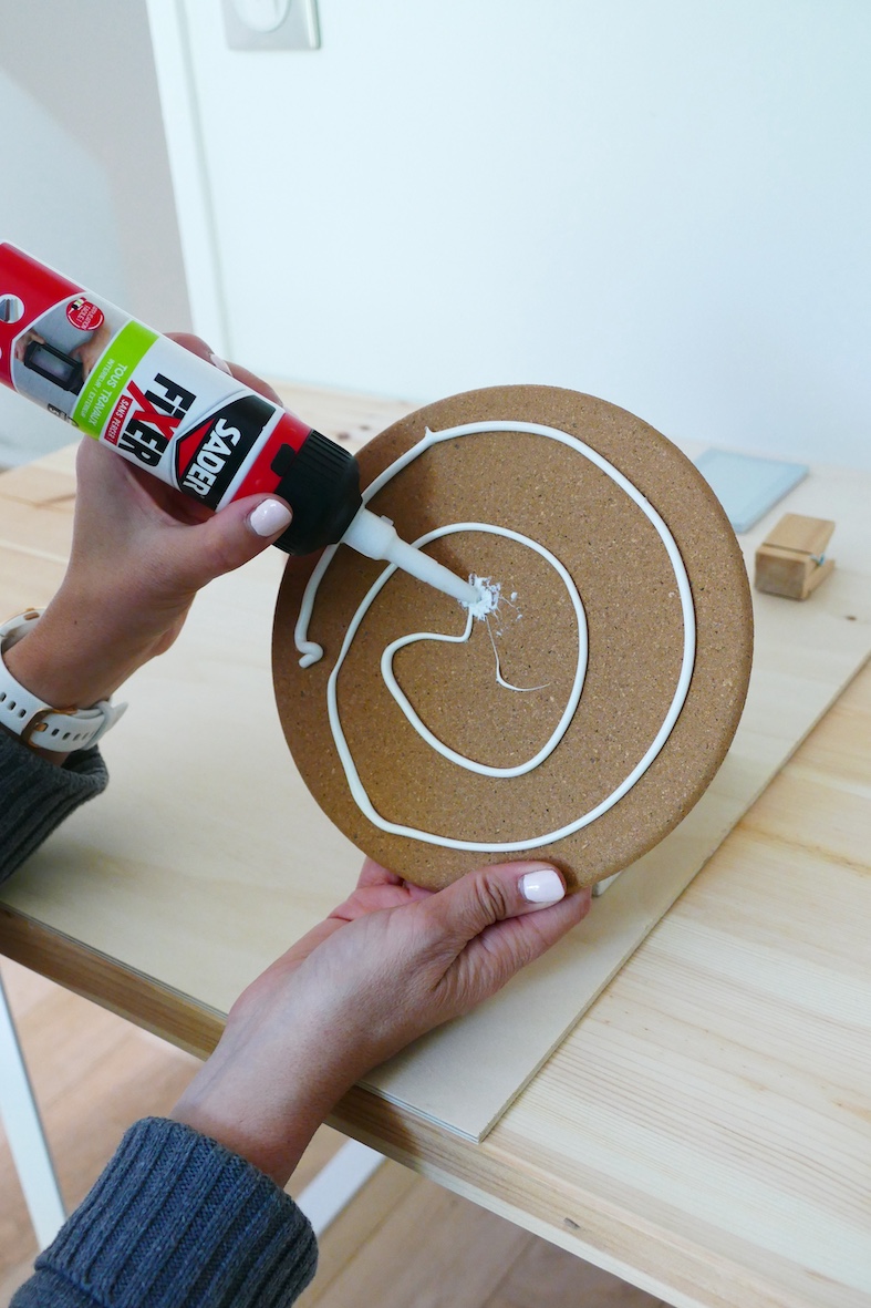 Étape 3 : Positionner les éléments à coller sur la planche de bois : le support en liège, la poche de cuir, une pince de bois, des post its…Lire la suite