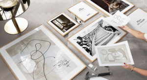 Quand vos cadres sont encore au sol, prenez le temps de trouvez l’espace souhaité entre chacun d’eux. Généralement, nous recommandons de laisser un espace de 5 à 10 centimètres entre chaque cadre. Vous pouvez tout à fait les rapprocher pour donner l’impression d’une seule grande œuvre, l’important étant que votre mur de cadres vous corresponde. Commencez avec un espace de 5 centimètres, et laissez-vous inspirer !