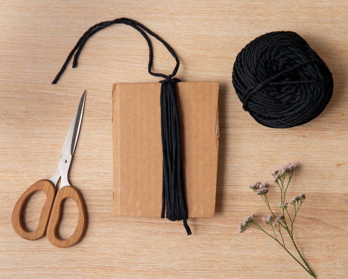 Enroulez le cordon XXL de coton autour du carton (hauteur 15 cm) en faisant 20 tours. Passez un cordon en haut entre le carton et nouez. Coupez les cordons du côté opposé et nouez un cordon à 2 cm du haut.Lire la suite
