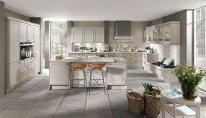 Enza « Sable fin » fait entrer la tendance cottage chic dans la cuisine pour une ambiance romantique et apaisante : 10 490 € avec électroménager Beko inclus (pack 1290€ : four, plaques, hotte, lave-vaisselle, frigo).