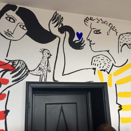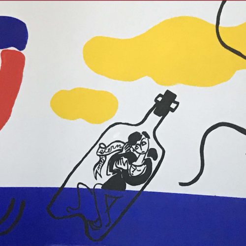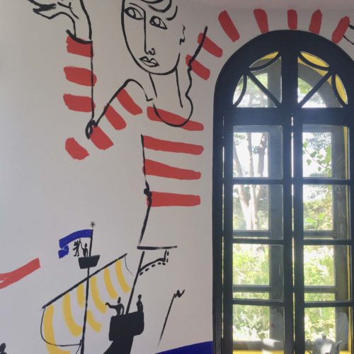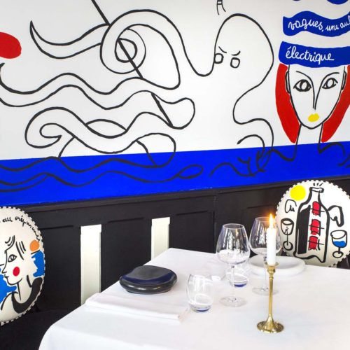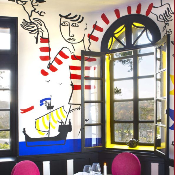 La mer, dont s’inspire aussi le chef et son équipe pour transmettre dans l’assiette un concentré de la Côte d’Albâtre, est le fil conducteur de l’oeuvre. Les personnages, tout en verticalité, vêtus de marinières, côtoient un super-tanker chargé de mots, un sous-marin immergé ou encore un pin parasol en apesanteur.