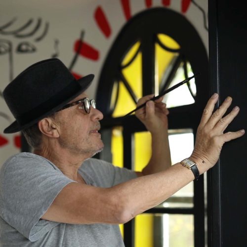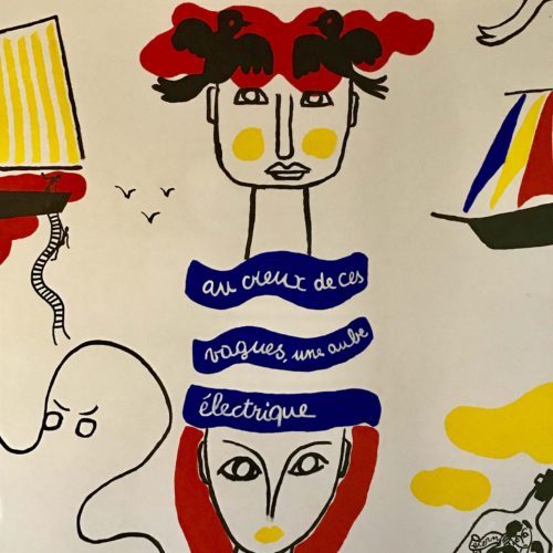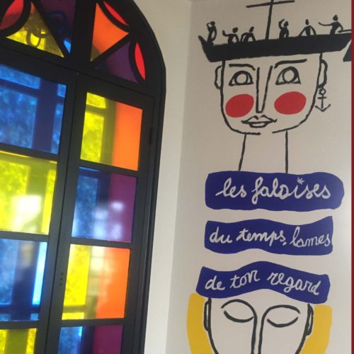Intitulée « Dans le sillage de deux mains », la fresque reprend la gamme de tons minimalistes de base, rouge, jaune et bleu, chère Jean-Charles de Castelbajac. Une inspiration graphique puisée dans les souvenirs de l’artiste. « Quand j’étais en pensionnat dans la région, la météo n’arrêtait pas de changer, entre pluie et beau temps. Je suis parti à la chasse à des couleurs que l’on retrouve dans les arcs-en-ciel mais aussi dans les vitraux et les blasons. »