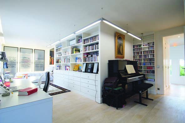 Allure stricte pour cette chambre, la plus grande de l’appartement. Elle a été conçue tout en longueur, ce qui permet de mieux absorber la lumière. Le piano Bösendorfer noir laqué est placé en retrait de l’espace repos. La bibliothèque a été réalisée sur mesure (Alain Marcillaud), tout comme le bureau (Alvaro). Sur le lit, housse de couette » Mélomane » et au sol tapis Saint-Honoré. Au fond, sur les placards en plexiglass sont imprimées des partitions. Lire la suite