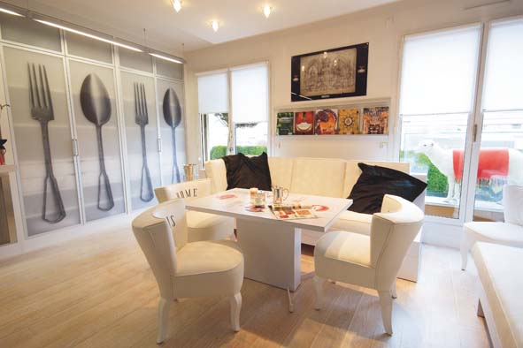 Dans l’espace salle à manger, les murs sont habillés d’un tissu blanc tendu éclatant, donnant une impression d’espace et de profondeur. Le canapé et fauteuils en cuir blanc ont été réalisés sur mesure d’après une idée de la maîtresse de maison, qui a opté pour une hauteur d’assise plus basse. A gauche, les placards sont en plexiglass et imprimés avec des motifs » couverts « . A droite, sur le balcon, le mouton, plus vrai que nature, donne un petit esprit » campagne » à la pièce. Lire la suite