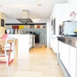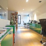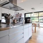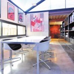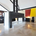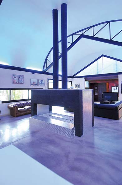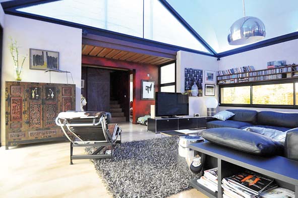 La structure métallique apparente et la cheminée sculpturale au centre de la pièce donnent à ce bel espace l’allure d’un loft. Un jardin zen et une véranda complètent agréablement cet ensemble, laissant entrer la nature dans la maison. L’alliance réussie du zinc, du béton, du métal et du verre associée à des aménagements haut de gamme fait de cette demeure un lieu rare baigné de lumière. Les volumes forment un ensemble d’espaces vastes, clairs et ouverts où seul le mobilier, intégré à l’architecture, vient séparer et structurer les différentes pièces. Le décor intérieur joue avec élégance sur le contraste des matériaux et des couleurs : gris des parpaings appareillés en ciment et du sol en béton, blanc des murs qui renvoie la lumière, noir de la structure métallique.