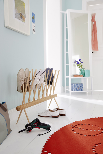 Pour finir, effacer soigneusement toutes les lignes de repère et placer les supports à chaussures et les pieds dans les trous. Si on le souhaite, il est possible d‘enduire au préalable les baguettes d‘un peu de colle à bois pour leur donner une tenue supplémentaire.