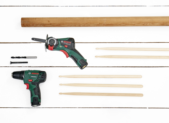 Le range-chaussures doit maintenant avoir des «pied ». Pour cela, quatre autres baguettes sont nécessaires, qui seront ensuite enfoncées sous le bâton de bois. Fixer chaque baguette solidement sur la table de travail et les raccourcir à une longueur totale d‘environ 30 cm depuis l’extrémité du manche. Les pointes en forme de boules servent ensuite de pieds. Il est très facile de raccourcir les baguettes à l‘aide de la scie multifonctions sans fil EasyCut 12 LI Bosch.