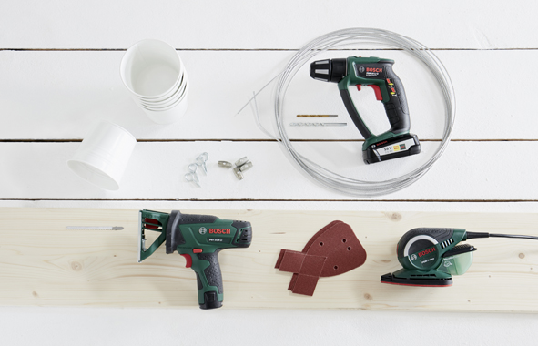 1 planche en bois (épicéa) d’environ 1 m de long, (18 x 200 mm). La longueur peut être adaptée à volonté et la hauteur adaptée à vos désirs.- Scie multifonctions sans fil PST 10,8 LI Bosch, avec lame de scie sauteuse pour bois