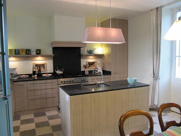 La cuisine offre une belle surface de 16 m2. Les meubles ont été réalisés sur mesure par la Menuiserie EGMB. Sol en pierre de Bourgogne. La fenêtre-baie est habillée de rideaux provenant de chez Nordiska. Boîtes en métal (Galerie Sentou). Lire la suite