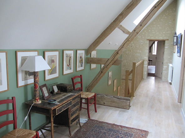 Le palier, sur lequel on retrouve le vert « anglais » sur les murs de sous pente, dessert deux chambres.Lire la suite