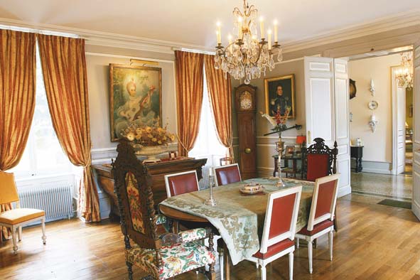 La convivialité est à l’honneur dans cette salle à manger où le lustre éclaire un pastel du XVIIIème représentant Madame Guimard, célèbre chanteuse d’Opéra de l’époque. En dessous, l’hôtel en chêne massif XVIIème accueille un vase en fonte et un bouquet de fleurs séchées. Autour de la grande table, les chaises en cuir rouge sont signées Jensem et l’imposant fauteuil est d’époque Napoléon III. La table est recouverte d’un tapis milieu XIXème en velours avec broderies en fil d’argent sur lequel sont posés un légumier anglais en argent massif et deux bougeoirs. De part et d’autre de la cheminée, on aperçoit deux vitrines abritant des collections d’assiettes en porcelaine XVIIIème et XIXème. Lire la suite