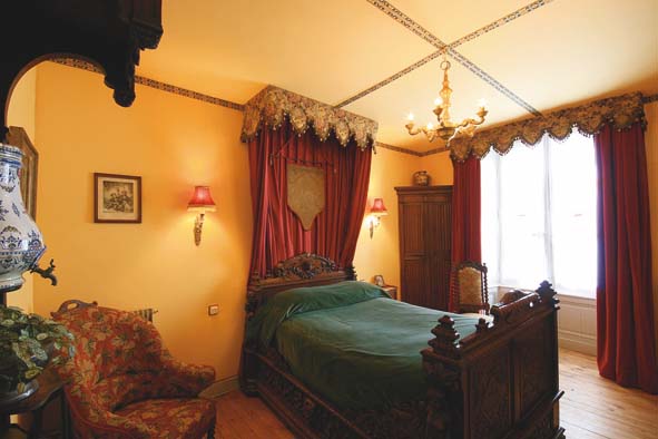 Le lit à dais provient d’un château. Au fenêtres, les rideaux pare-soleil sont en lin et brodés de couronnes comtales rouges. Les murs sont habillés de tissu jaune d’or. Lire la suite