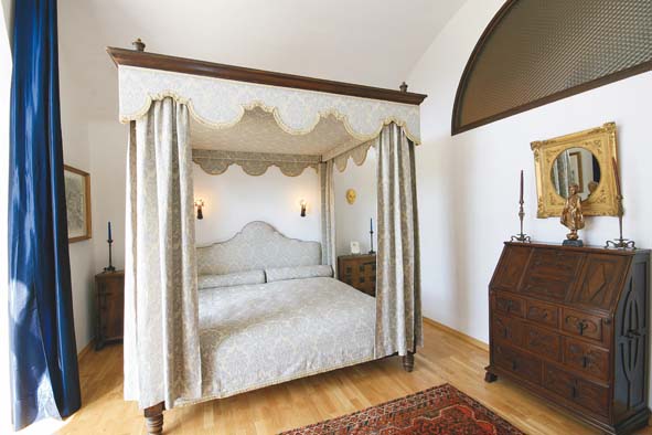 Mur en crépi blanc, double rideaux bleus et lit à baldaquin pour la chambre.Lire la suite