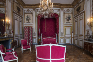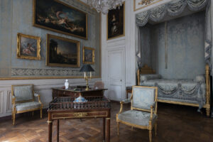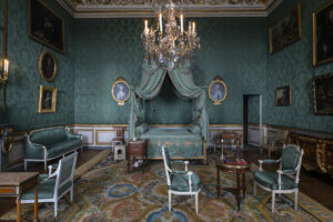 La restauration des décors, voulue par le Centre des monuments nationaux et ses experts, a mis en valeur les rideaux, les tissus d’ameublement et papiers peints afin de rendre aux pièces des appartements de l’intendant, comme aux pièces de réception, leur atmosphère d’origine. Deux pièces, la chambre de Thierry de Ville d’Avray et la chambre de Mme Thierry de Ville d’Avray, étaient entièrement tendues de textiles. Il n’a malheureusement pas été possible de trouver un métrage suffisant pour refaire entièrement la tapisserie avec du tissu d’époque. Aussi, en 2019, le Centre des monuments nationaux lance un appel d’offre pour la réalisation des textiles de l’hôtel de la Marine que la Lelièvre remporte ! Pour la Maison, un des enjeux majeurs dans ce projet de rénovation était la réalisation à l’identique d’un décor figé par le temps depuis plus de 200 ans. Pour répondre à cette problématique, l’entreprise a rédigé un mémoire expliquant ses pistes de réflexion textiles et soulignant l’expertise et l’accompagnement de sa Manufacture Tassinari & Chatel pour la bonne réalisation des commandes pointues de l’Hôtel de la Marine. Puis à partir d’une étude minutieuse des descriptifs d’inventaires et des élévations si particulières des pièces de l’hôtel, Lelièvre a su proposer des choix textiles pertinents et audacieux tous issues d’archives de Tassinari & Chatel, accompagnés de nombreux essais de coloration et tissage afin d’obtenir un textile au rendu extrêmement proche de celui d’origine.