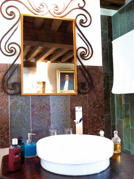 Le miroir année 50 provient d’un vide-grenier. La faïence est en ardoise oxydée « Evian ». (Ekolux). La vasque en céramique (Mr. Bricolage) a été posée sur une table octogonale en chêne des années 20, chinée et dotée d’une robinetterie (Ekolux). Le tableau qui se reflète dans le miroir est signé d’un peintre bordelais du XIXème siècle (Brocante de L’Entre Deux Mers). Le plafond à la française en chêne date du XVIème siècle. Il est resté dans son jus.Lire la suite