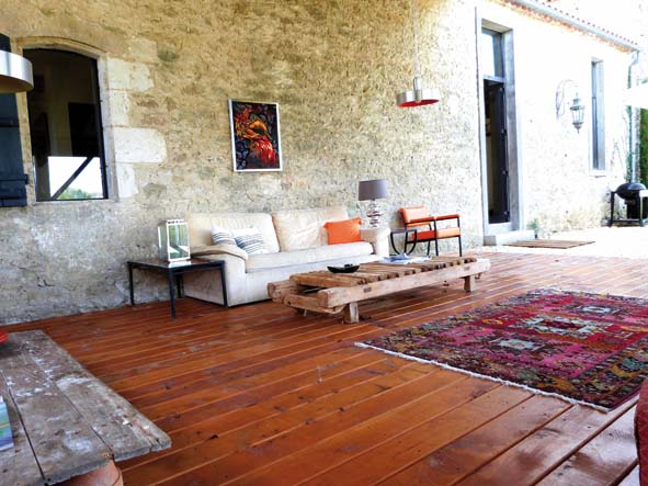 Sur la terrasse couverte, les luminaires en inox brossés ont été achetés à la Clinique du Luminaire à Le canapé en velours beige “années 80” a été chiné (Le Grenier d’Antan). Le fauteuil orange “années 70” provient d’un vide-grenier, comme la tapisserie accrochée au mur. La table basse a été fabriquée avec un appareil à presser les feuilles de tabac trouvé dans la maison. Tapis année 30 (Le Bon Coin). A gauche, la table basse a été réalisée avec une vieille porte trouvée sur place et de quatre pots de fleurs en terre. Sol en cèdre (Charpente Conord). Lire la suite