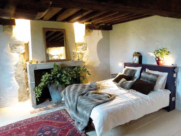 Au sol, datant du XIXème siècle, grand tapis iranien en laine. Le plafond à la française en chêne a été laissé brut, et date du XVIème siècle. Ancien parquet teinté «Joash White» (Farrow & Ball). Les murs ont été badigeonnés à la chaux fine et blanche (Renocal) pour redonner un aspect lumineux aux enduits anciens (Eric Belair). Lit (Ikea). Tête de lit en placo (Polesello) peint « Pelt » (Farrow & Ball). Appliques « liseuses » (Ikea). Coussins et jeté de lit imitation fourrure (Fly). La pendule d’époque Louis XVI provient de la famille. Sur la cheminée, miroir en bois doré fin XIXème chiné. Lire la suite