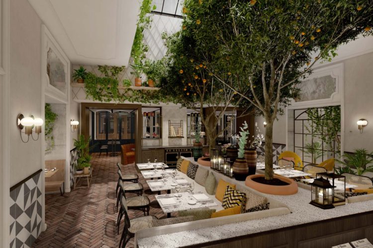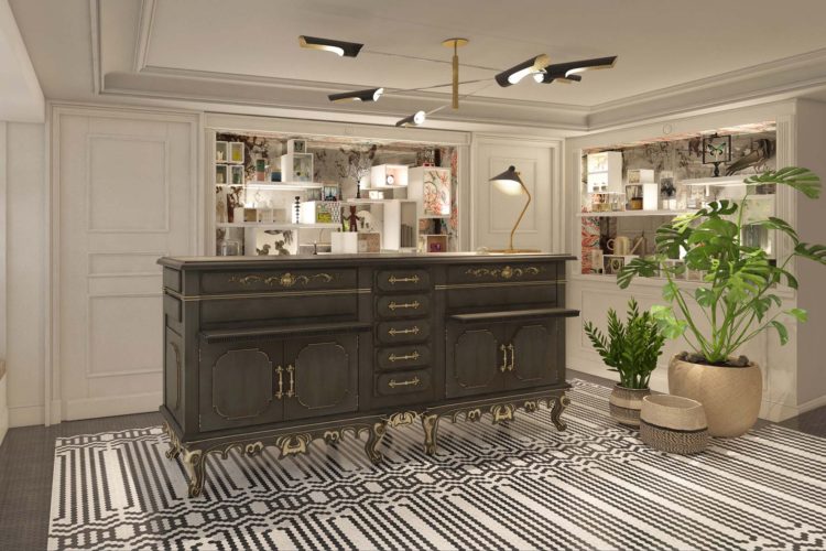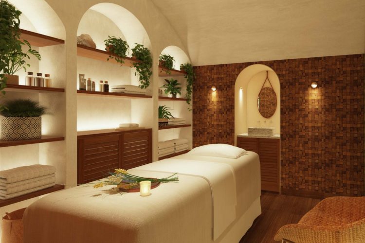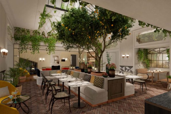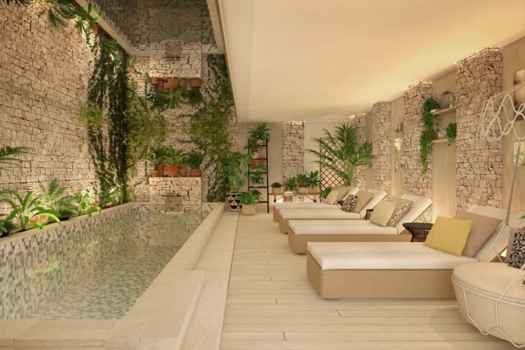 Dans les chambres, les matières douces et naturelles comme le velours, le lin ou encore le coton, sont déclinées dans des coloris clairs et feutrés et forment une ambiance douillette, où ressurgissent les souvenirs d’enfance. Toutes différentes, elles déclinent plusieurs ambiances douces et cocooning, du rose poudré, des teintes bleutées, du vert de gris… Des cadres suspendus aux murs, de jolies appliques dépareillées, des coussins à motifs, un mobilier patiné par le temps, concourent à renforcer cette impression d’un lieu qui aurait été meublée avec soin au fil des années, au gré des inspirations d’une maîtresse de maison au goût certain, ou des retours de voyages de l’un ou de l’autre de ses occupants. Les pièces à vivre, raffinées et cosy, incitent l’hôte à la détente et au lâcher-prise. Le salon, décoré dans le style d’une bibliothèque, invite à prendre un verre confortablement installé dans le canapé. Le chaleureux jardin d’hiver, baigné par la lumière de quatre baies vitrées et d’une verrière sous laquelle s’épanouissent un oranger et des plantes tombantes, offre quant à lui, une atmosphère lumineuse, fraîche et intime. Le Spa, aux allures de jardin toscan, avec ses parements de pierre dorée, ses fauteuils en osier tressé et la présence d’une végétation luxuriante autour du bassin est un cadre idéal pour se laisser aller aux douceurs d’une pause «slow life». Hôtel Royal Madeleine – 29 rue de l’Arcade, 75008 Paris (www.hotelroyalmadeleine.com).